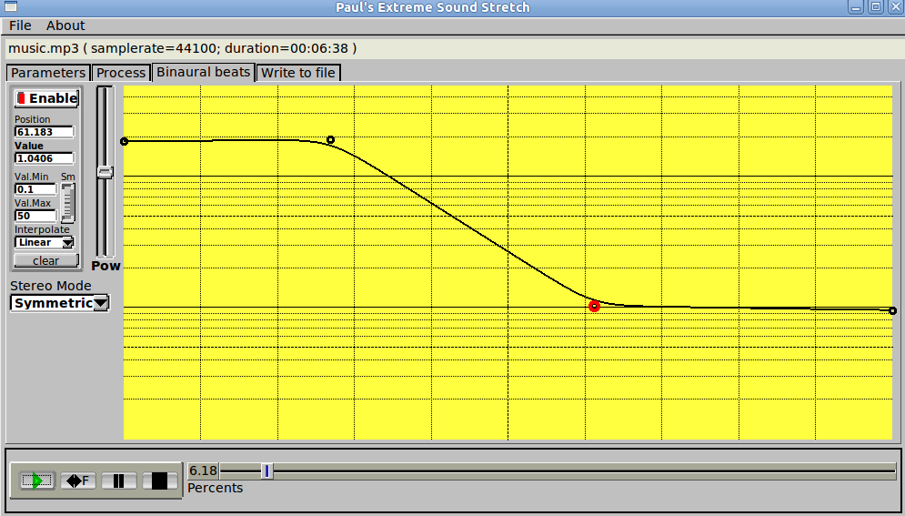 This controls the generation of binaural beats. The graph represents the binaural beats' frequency according to the position in the input audio. You can control the intensity of it with the "Vol" slider.