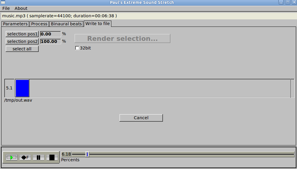 You can select the desired part of the sound and render it to disk as wav (16 bits or 32 bits) or ogg vorbis. The select pos1 and select pos2 sets the limits of the selection from the percents(playback) slider. While rendering, the interface will be a bit less responsive, but you can still play the current sound or select and play another sound.